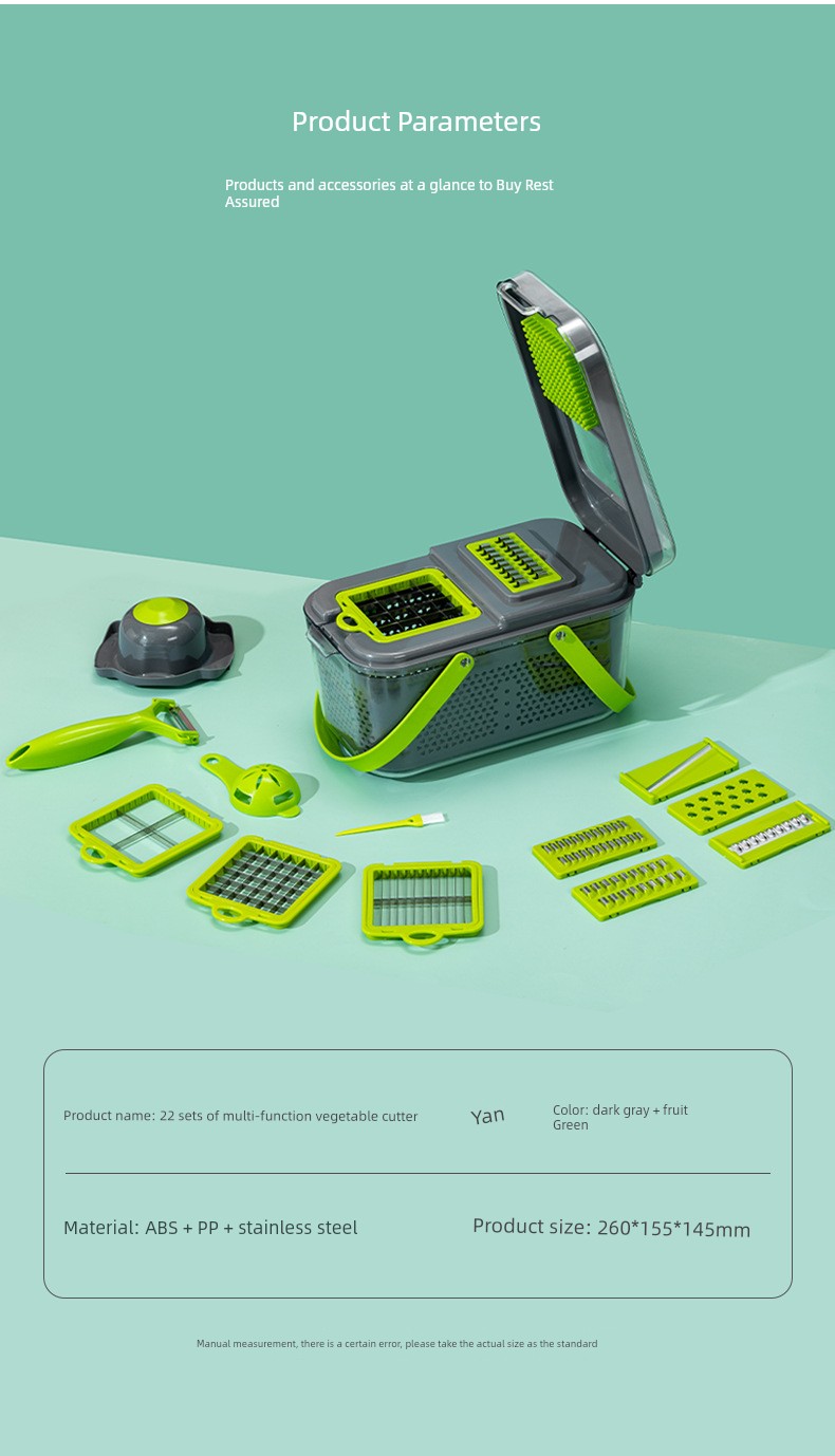 Kitchen Vegetable Cutter Chopper Fruits Slicer Multi-Function Vegetable Chopper Share WhatsApp Deel X Pin it Messenger Email Kitchen Vegetable Cutter Chopper Fruits Slicer Multi-Function Vegetable Chopper Share WhatsApp Deel X Pin it Messenger Email Product form SPECIFICATIONS Read more Color classification Free pickup in our shop(s) Small green and white grid Gray-green large grid Gray green 22 piece set (Best Selling) Free pickup in our shop(s) SKU: 1627207:2933899064 $19.45 Quantity Add to cart This item is a recurring or deferred purchase. By continuing, I agree to the cancellation policy and authorize you to charge my payment method at the prices, frequency and dates listed on this page until my order is fulfilled or I cancel, if permitted.