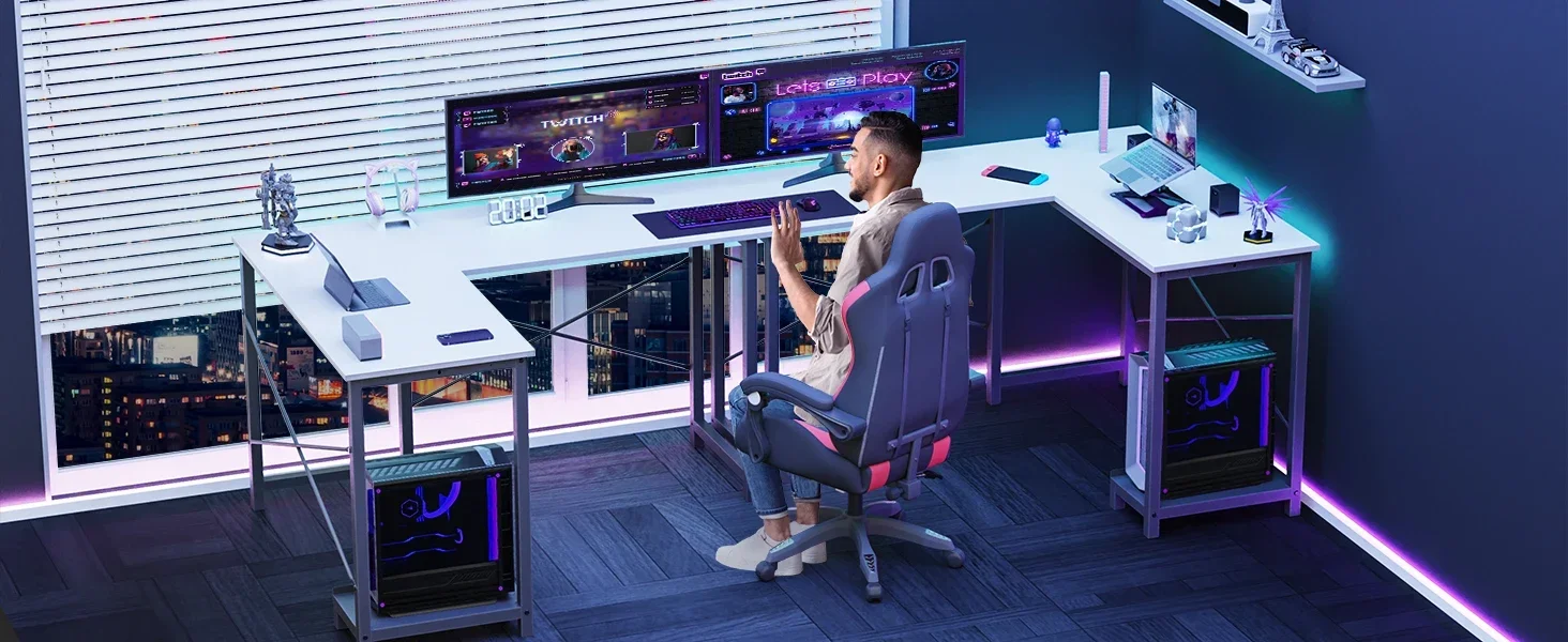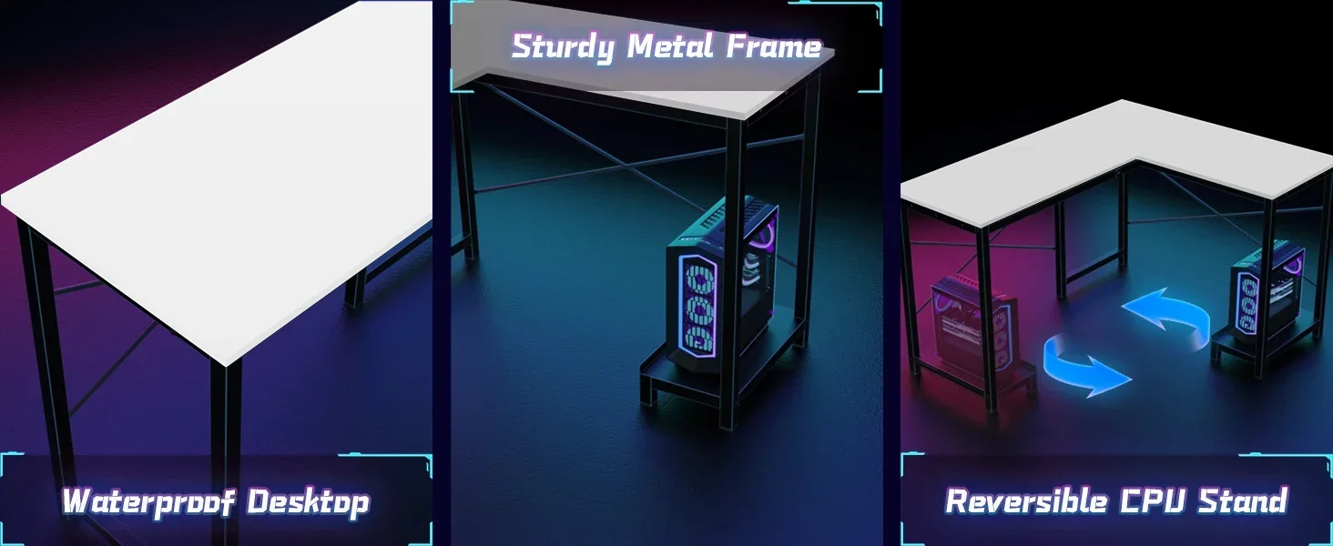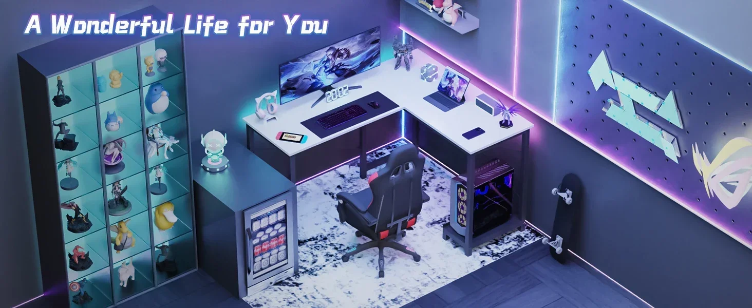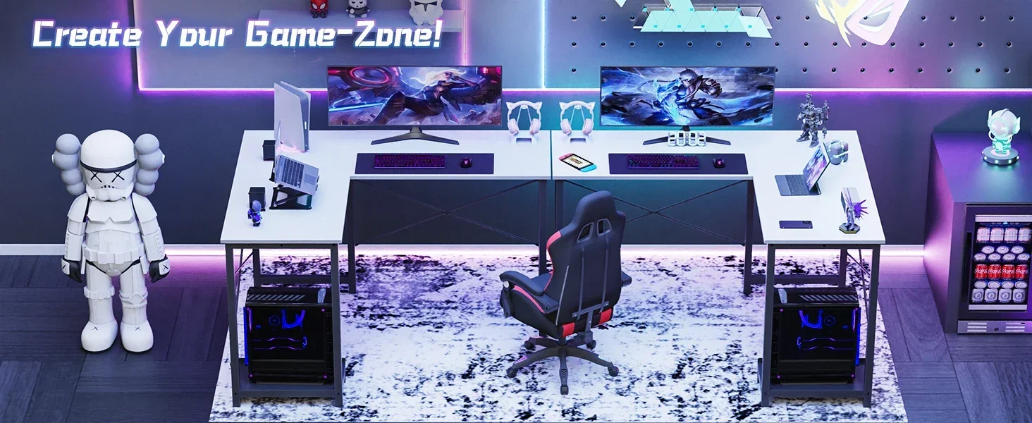 【Modern L-Shaped Wood Desk 】The l shaped design of the new super gaming desk can effectively use the corner space while providing more storage space. Same time, switching to this gaming desk will release the center area of the room and make the activity space wider. Make your game room full of energy.