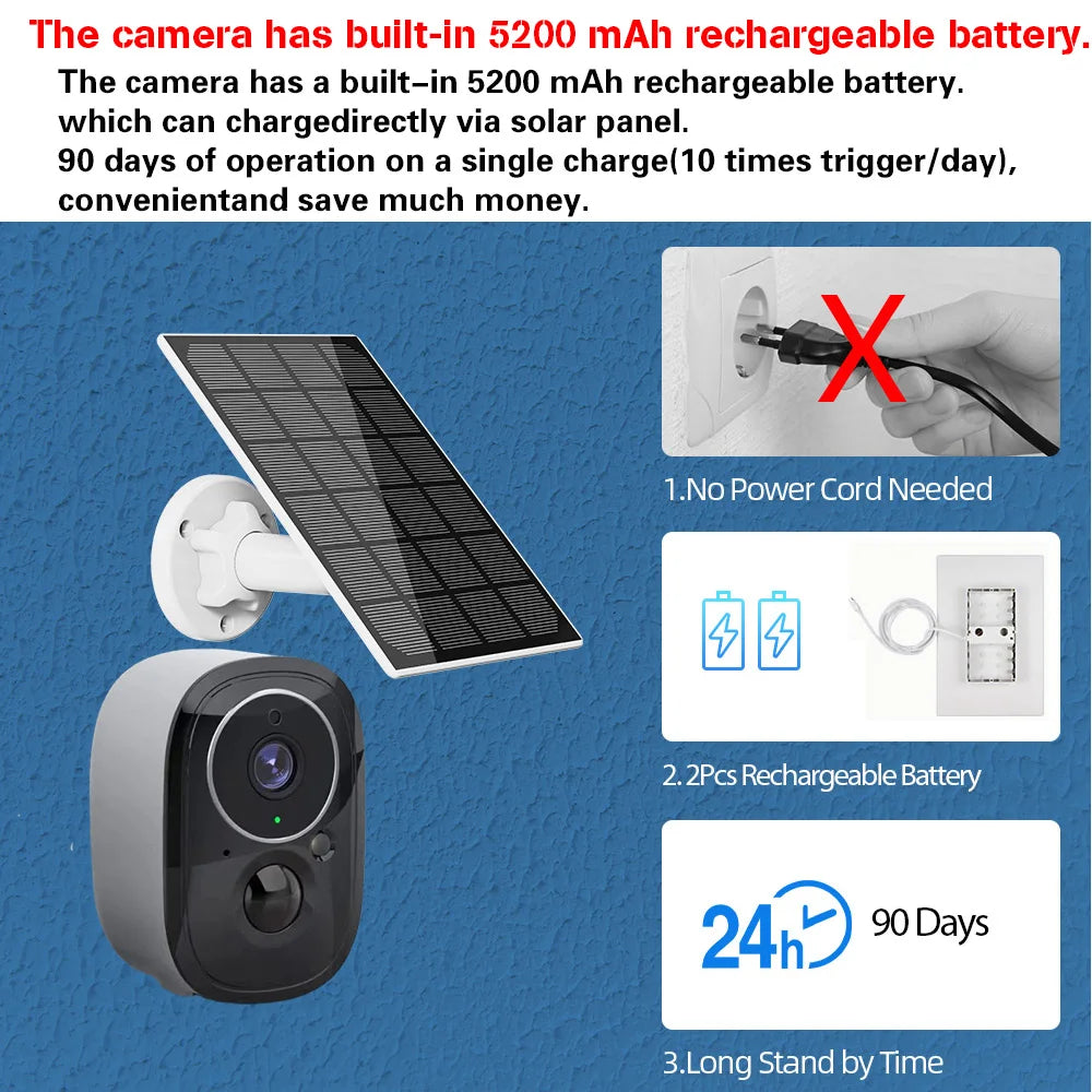 The camera has a built-in 5200 MAh rechargeable battery(Non-replaceable battery).which can charge directly via solar panel.90 days of operation on a single charge (10 times trigger/day), conveniently save much money.