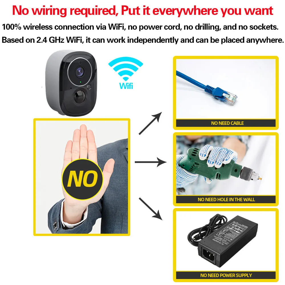-Not a single cable is needed anymore, you can save the hassles of plugging in the power and enjoy complete wireless freedom. Just place the IP camera anywhere in your house, connect it to 2.4Ghz WIFI then you can start to record immediately...