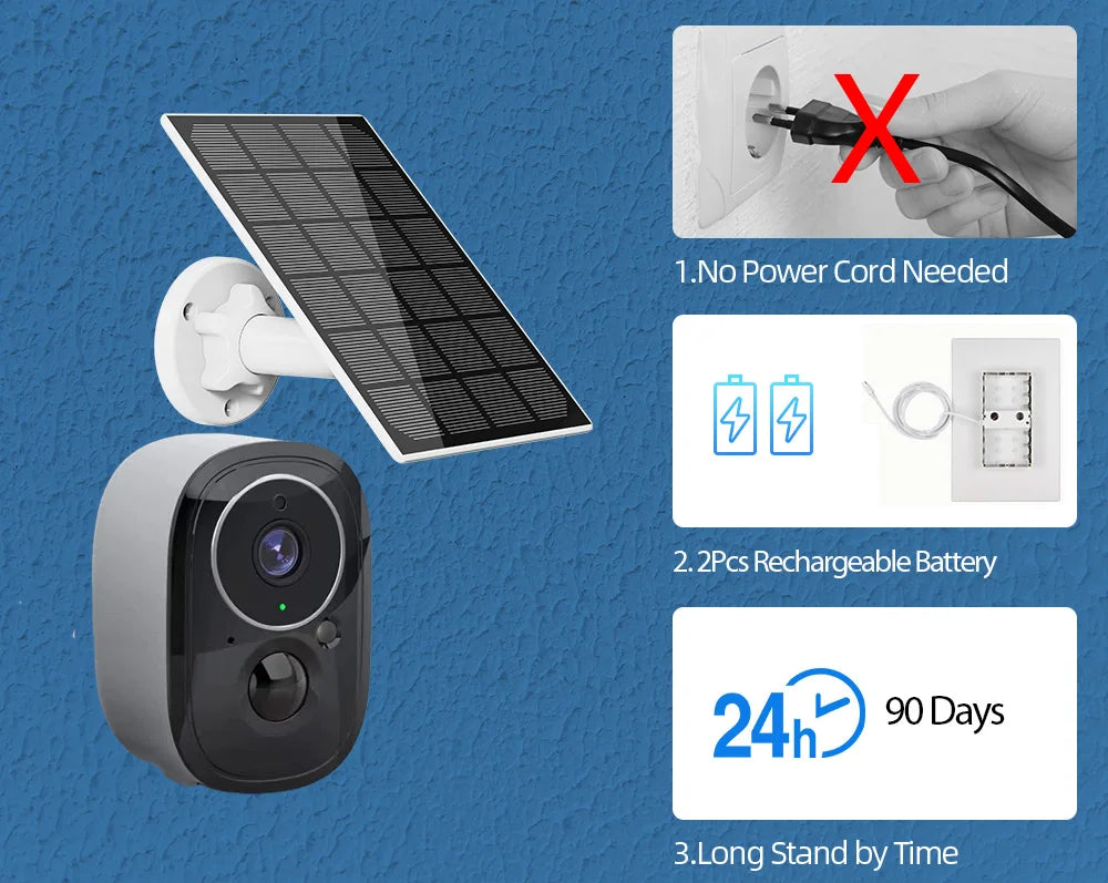 Tuya Smart wireless security Camera helps you say goodbye to cumbersome wires and frequent charging. Support 2.4GHz WIFI only. The outdoor security camera wireless has a more durable standby capability for up to 3 months after being fully charged for 8 hours.